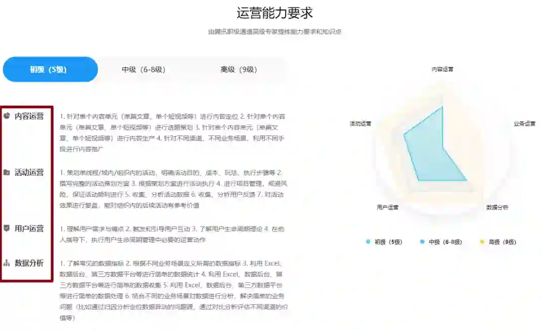 翻看腾讯运营人能力标准模型,得出初、中、高每个级别需要掌握的能力要求,给大家参考。