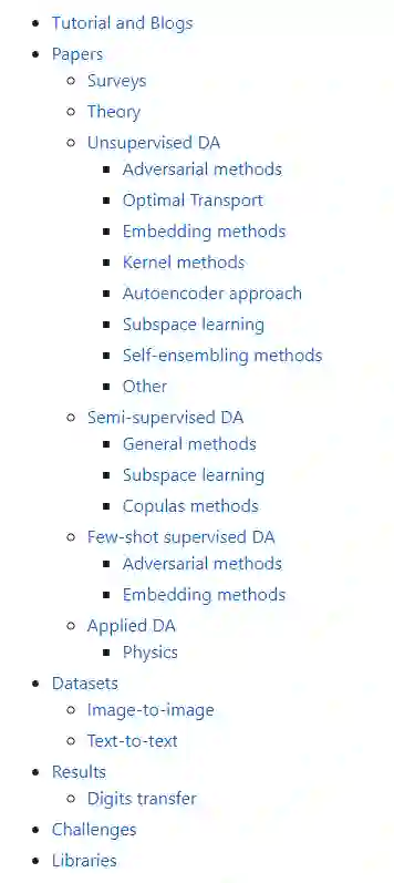 本库收集了大量的迁移学习以及领域自适应的论文和项目资源,虽然该库的资源主要针对领域自适应技术,但是也有些迁移学习其他子领域的资源供各位开发者参考学习。