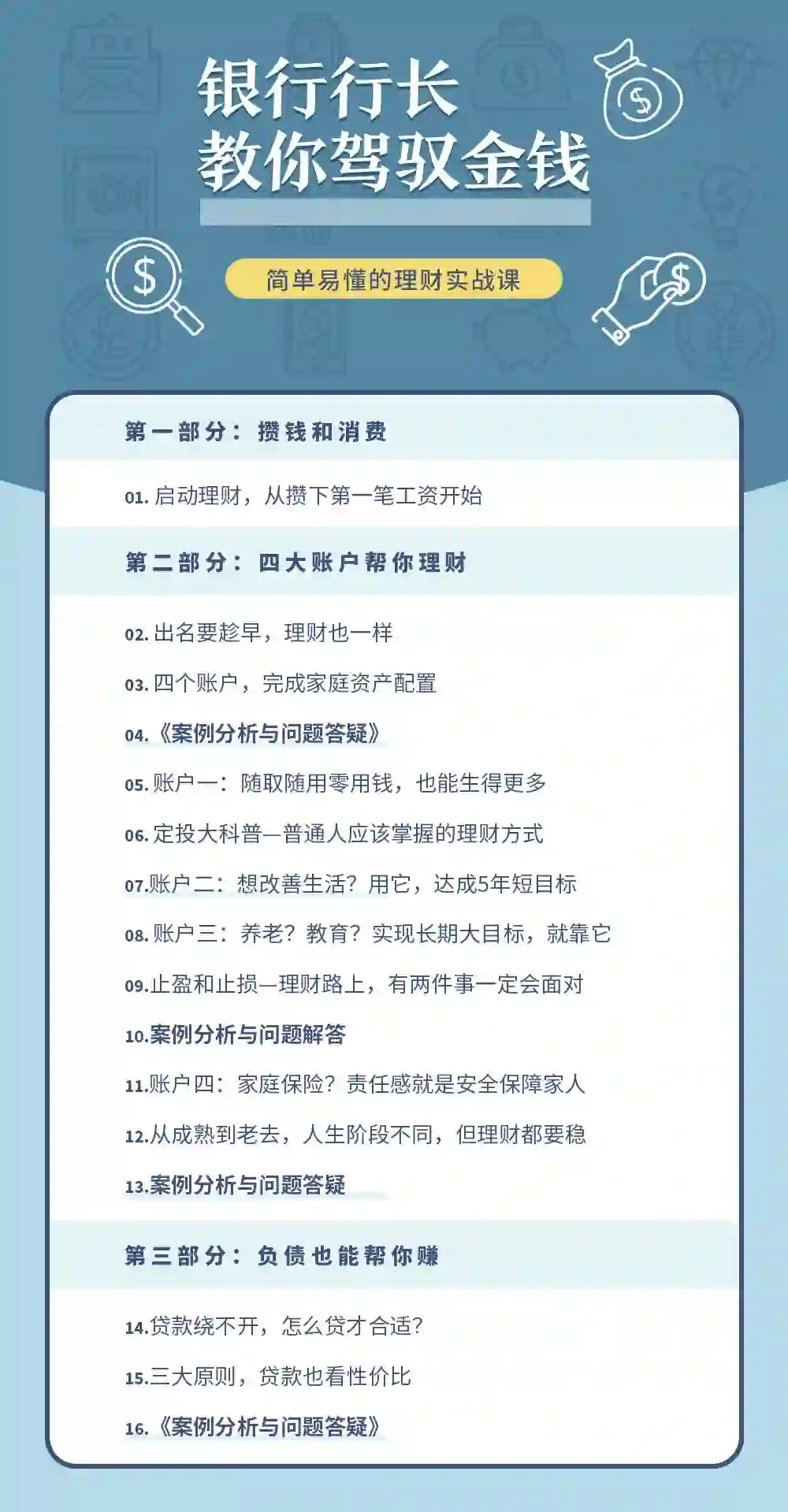 于是今天,我来到了十点课堂,把我这十几年的行业经验和10万用户的经验教训融汇贯通成《银行行长教你驾驭金钱——简单易懂的理财实战课》,献给大家。
