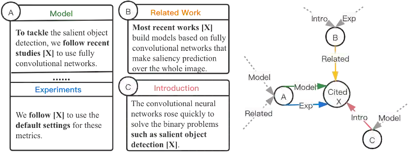 为了生成在文章中不同章节位置对应特定的引文内容,作者通过构造一个包含4800个节点(每个节点代表一篇论文)和25000个具有不同边类型的引文网络。