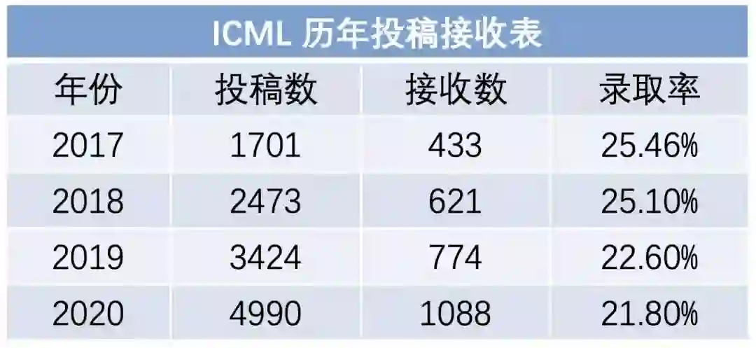 ICML 2021一共有5513篇有效投稿,其中1184篇论文被接收,接收率为21.4%,也是达到了五年内最低接收率。