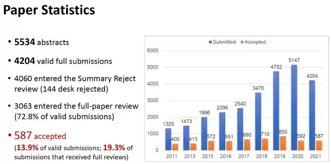 就难度而言,IJCAI 2021似乎就比AAAI 2022还要惨烈,进入摘要审查阶段的4060份提交材料中,大会最终只接收了587份投稿,接收率仅为13.9%。