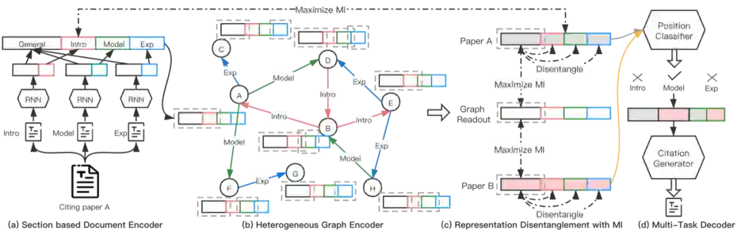 基于构建的引文网络,作者提出了一个解耦合的图神经网络用于提取「引用-被引」论文pair中的文本和引用拓扑信息,并利用这些信息进行引用章节预测和特定章节的引文生成。