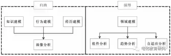 在图3所示的“1+3”模式(演绎)中,基于学习内容和结果进行建模与分析,即通过对领域进行建模,从而进行组件分析、趋势分析以及自适应和个性化分析。