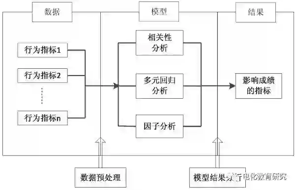 学习行为影响分析模型的构建:选取学生行为指标数据并进行数据预处理,在建立模型分析行为指标对成绩的影响时主要使用相关性分析、多元回归分析和因子分析三种方法。综合分析不同方法得出的结果,可以得出对学生成绩有显著影响的指标。学习行为影响分析模型框架如图4所示。