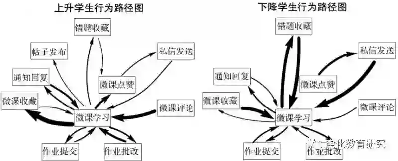 智慧课堂教学活动的主体是学生,无论是课上抑或是在课下,学生都有多种多样的学习行为。例如:在课下学生通过智课平台观看微课视频、完成习题作业、与同伴进行讨论,或向教师私信提问;在课上学生可以针对教师提出的问题进行抢答发言,学生之间合作完成小组任务等。利用上述智慧课堂实际数据,对学生学习行为进行分析,得出成绩上升与下降的两个群体行为的差异可视化图示(如图8所示)。图8中的箭头方向表示了行为的先后关系,箭头的粗细表示了行为的发生频率。