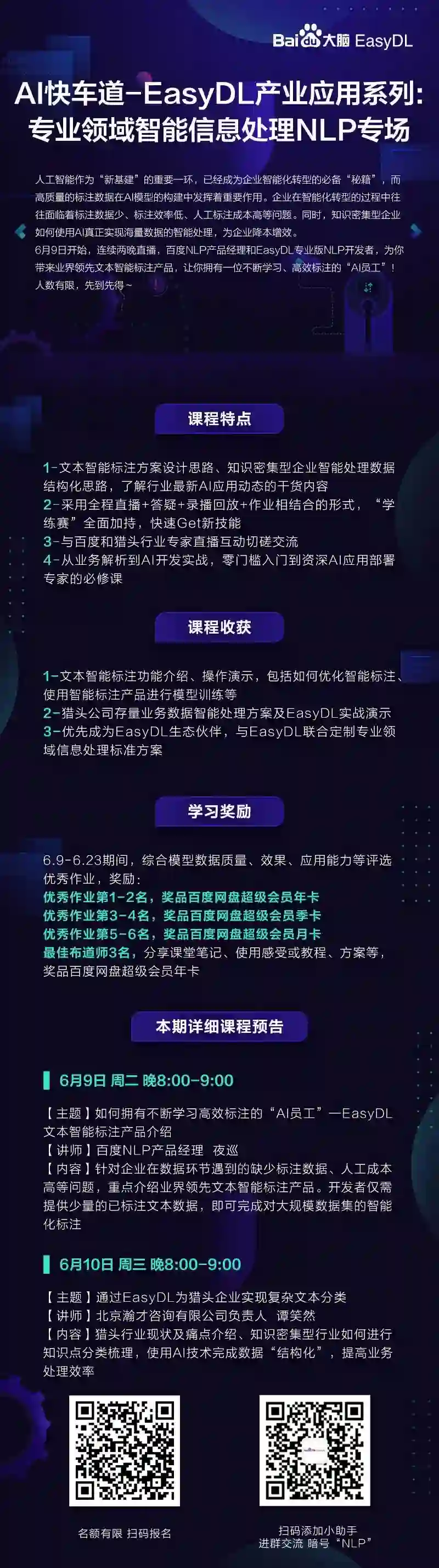 6月9日开始,连续两晚直播,百度NLP产品经理和EasyDL专业版NLP开发者,为你带来业界领先文本智能标注产品,让你拥有一位不断学习、高效标注的“AI员工”!