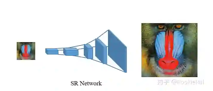 超分辨率(简称超分),是将低分辨率图像放大到高分辨率图像,如下图,一只小狒狒经过 SR网络后,可以得到放大,变成一只“大”狒狒。
