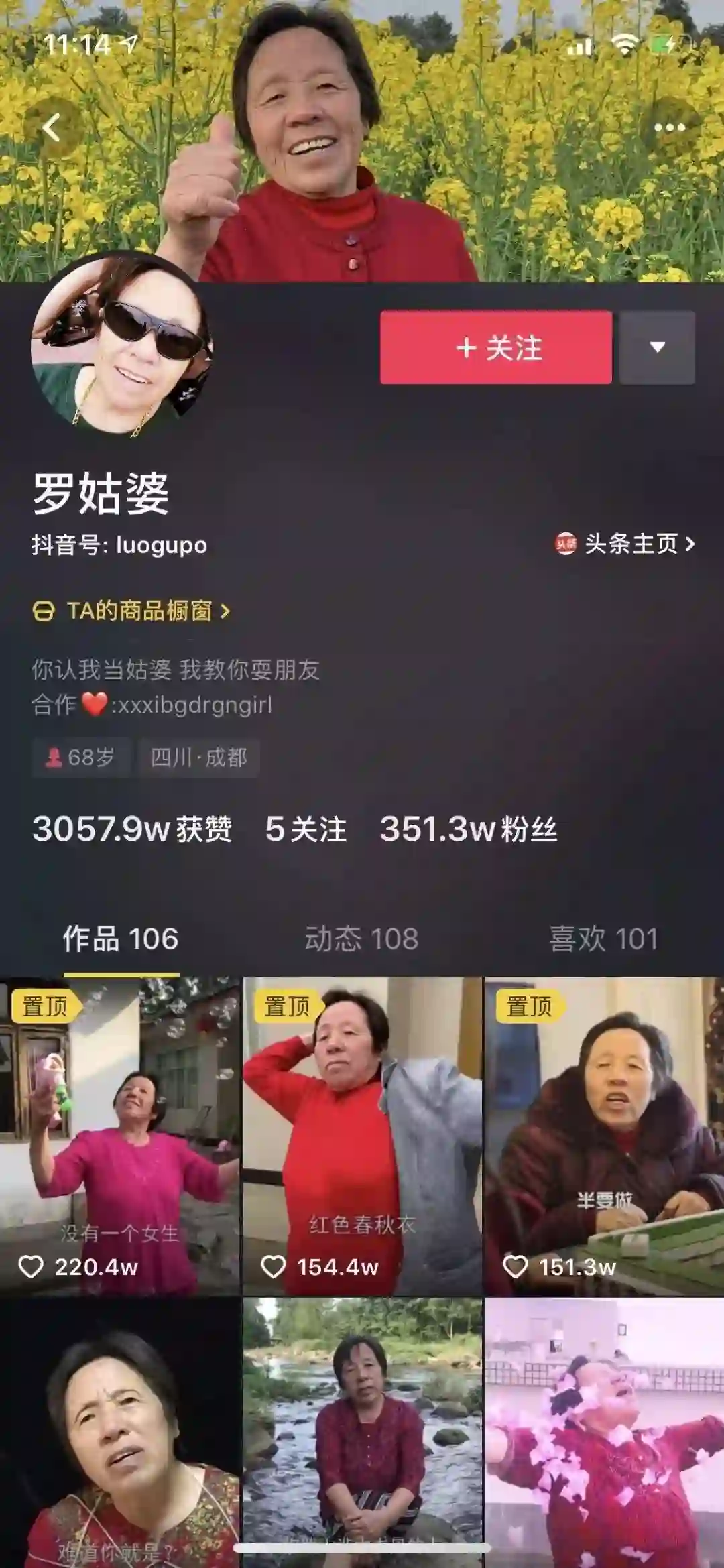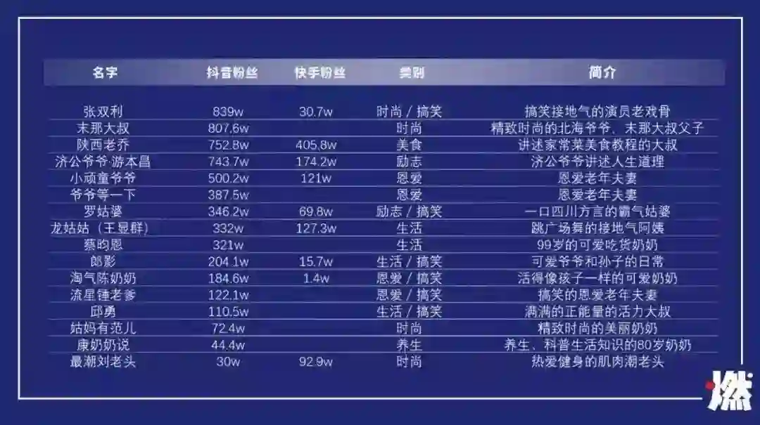 她还不是一个异类,根据燃经济的不完全统计:老姐姐老哥哥们都已经在抖音快手上争先恐后地火了起来,粉丝量高达百万……