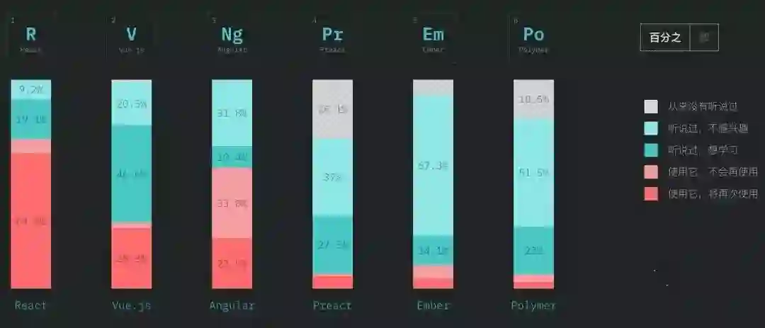 根据《2018 年度JavaScript趋势报告》显示,目前React 在前端领域流行度最高, Vue 排名位居第二,但从“使用过并且将再次使用”的比例来看,Vue和React相比仍有不小差距。