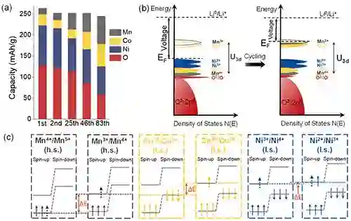 图3 Li1.2Ni0.15Co0.1Mn0.55O2不同充放电周次的氧化还原反应(a)不同元素在不同充放电周次对容量的贡献;(b)电子结构变化带来的锂离子储存电势的变化;(c)不同过渡金属氧化还原电对能级差异与电压衰减关联。