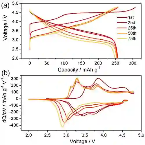 图1 Li1.2Ni0.15Co0.1Mn0.55O2不同充放电周次的(a)充放电曲线和(b)循环伏安曲线。