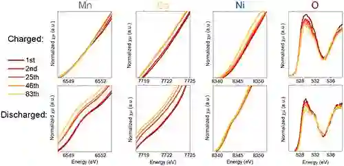 图2 Li1.2Ni0.15Co0.1Mn0.55O2中不同元素在不同充放电周次的X射线吸收光谱。