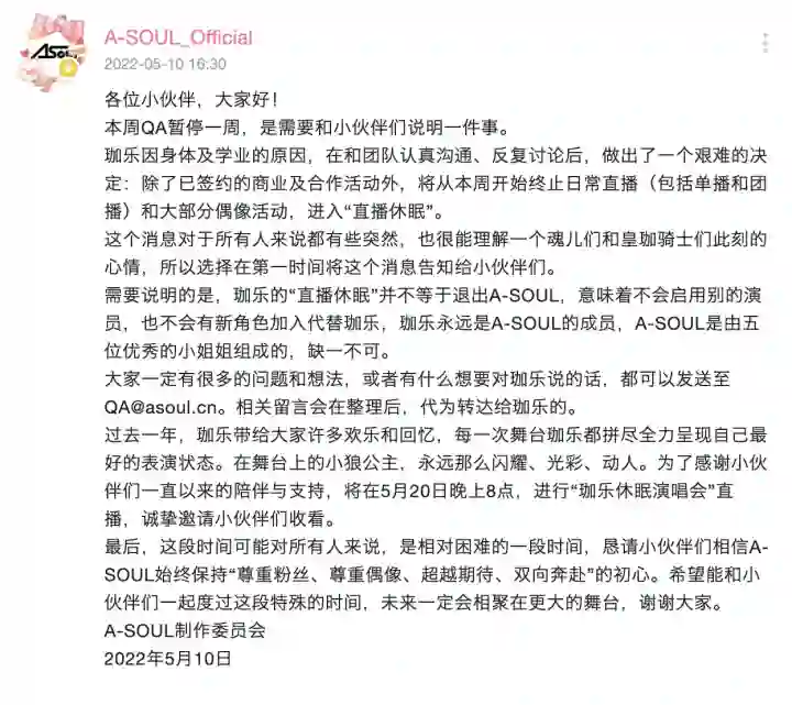 导火索是5月10日下午A-SOUL官方账号宣布的一位组合成员退出的消息,该消息表示:A-SOUL组合成员之一、团队Vocal担当珈乐因身体及学业问题,除了已签约的商业及合作活动外,将从本周开始终止日常直播(包括单播和团播)和大部分偶像活动,进入“直播休眠”。