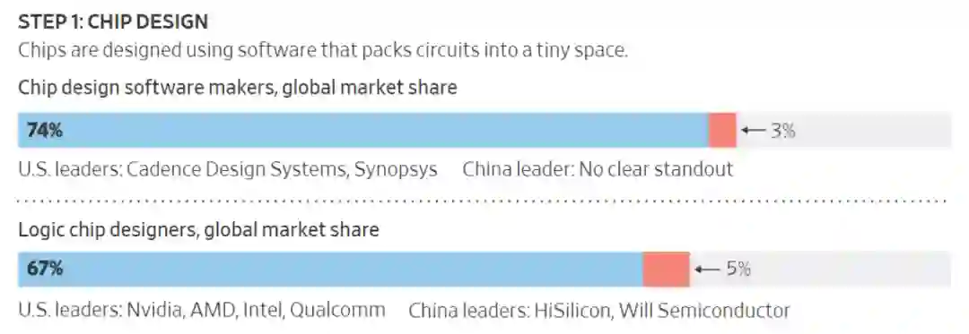 前者又称芯片设计自动化(EDA),美国占据绝对优势: