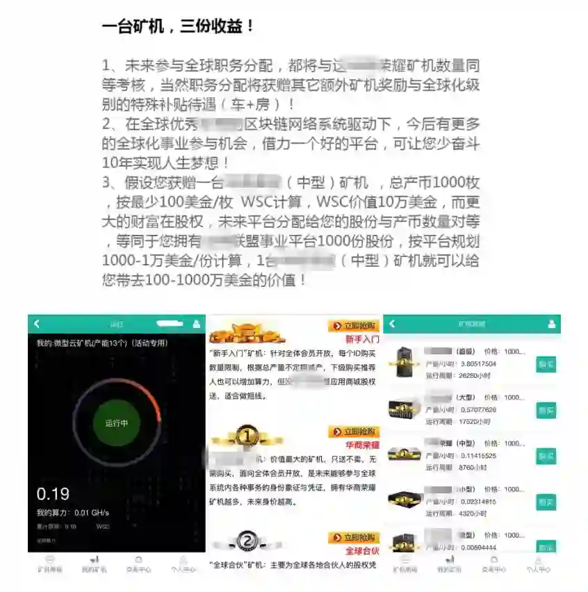 而这些矿机本身也是套路满满,许多项目会在你帮助转发宣传或者注册开户时送你矿机,以及将矿机作为满足各种条件后的奖励来送给用户,以吸引用户“挖矿赚钱”,这些赠送及奖励的矿机往往是最初级的矿机,产出效率低,用户在体验到这些矿机确实能不断生钱后,往往就会想去升级或购买更多更好的矿机,这就需要用户花钱购买更多的币来买这些矿机。
