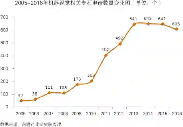 2005-2014年,我国机器视觉相关专利申请数量逐年增加,2014年达到645个。近两年,专利申请量所有下降。2016年,我国机器视觉相关专利申请数量为603个。