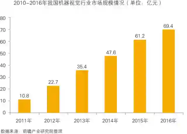 2011年我国机器视觉市场开始启动,行业步入快速发展期,2011年我国机器视觉行业市场规模约10.8亿元;2013年达到35.4亿元,同比增长55.94%;到2016年,市场规模达到69.4亿元,同比增长13.40%,约占全球市场15%的份额。