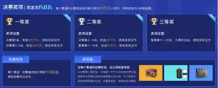 在奖金方面,每个赛道奖金池总额分别为 50 万人民币,大赛总奖金池高达 150 万。此外,在每个赛道的初赛阶段,大赛设立周周星奖励。从初赛第三周开始,以每周一中午 12 点的排行榜为准,取前两名参赛队伍发放周周星特别礼物。