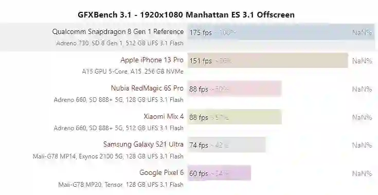 巨大的提升幅度,让骁龙 8 Gen 1 硬刚苹果 A15。知名图形跑分软件 GFXBench 测试结果显示,骁龙 8 Gen 1 工程参考设备在多个项目中战胜了 iPhone 13 Pro。大家比较看重的 GFXBench 曼哈顿 3.1 离屏测试项目上,骁龙 8 Gen 1 最终成绩 175fps,小胜 iPhone 13 Pro。