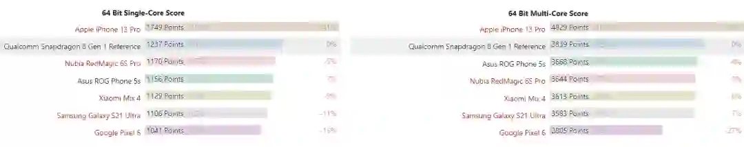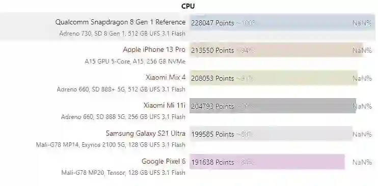 安兔兔的 CPU 跑分结果有些类似, 骁龙 8 Gen 1 的 CPU 跑出 22.8 万分,骁龙 888+ 的小米 MIX 4 为 20.8 万分,安兔兔跑分冠军为黑鲨 4S Pro 是 21.2 万分(图表未列出)。两相对比,提升同样不多。