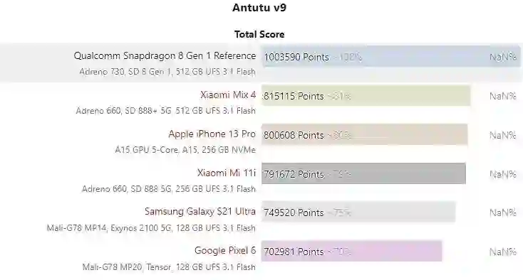 虽然 CPU 提升不多,但是总体表现的提升依然惊喜。骁龙 8 Gen 1 的安兔兔 V9 总分突破 100 万分里程碑,首次在手机上超过 100 万分,而骁龙 888+ 手机普遍在 80 万分出头,最高也不过 87.5 万。