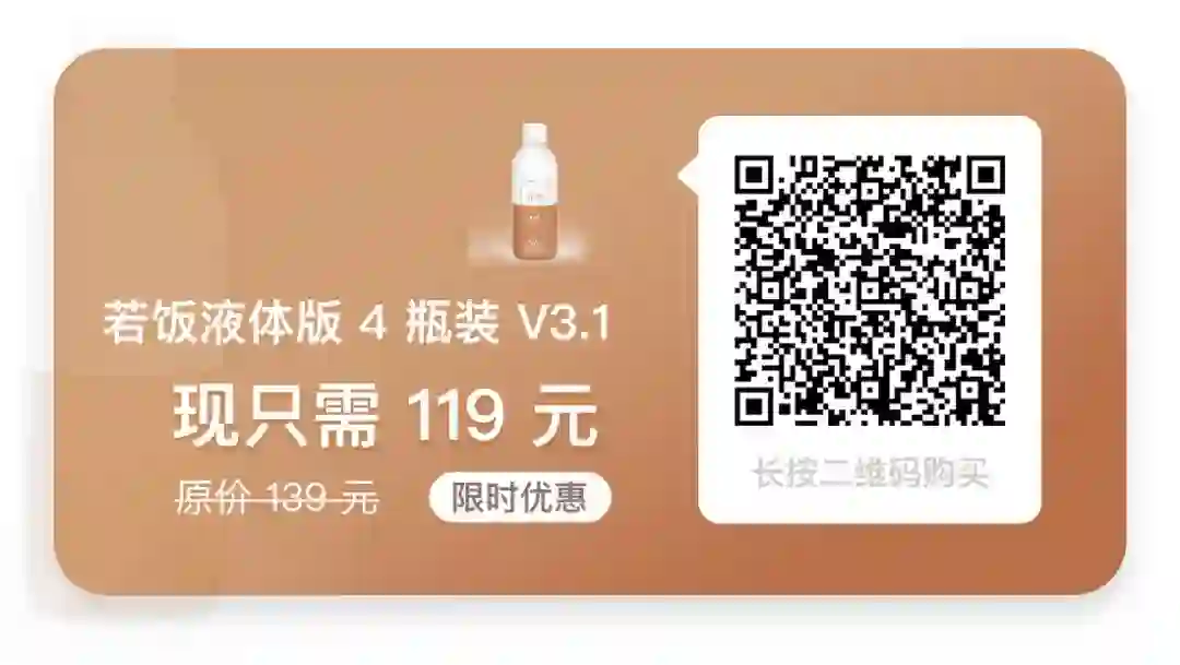 若饭 V3.1 即饮瓶可以为你提供 4 小时以上的饱腹感,同时满足了时下能量和营养的需要。在 3.1 版本中,每瓶若饭中还特别添加了相当于一杯美式八分之一的咖啡因,让你在特定时期更好地提升精力。