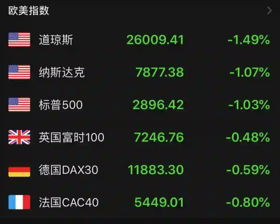 北京时间9月3日,美股三大股指皆大幅低开,道指跌0.81%,纳指跌0.71%,标普500指数跌0.63%。在美国相关经济数据公布之后,美股加剧下行,三大股指跌幅皆达到1%以上,其中道指盘中一度杀跌400点,并跌破26000点重要关口,市值蒸发约4500亿美元,折合人民币达3万亿元。欧洲主要股指亦受美股带动下跌。