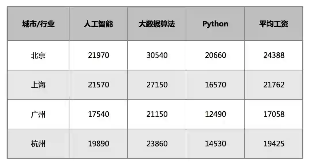 最新数据:人工智能、大数据算法、Python相关岗位平均薪资表
