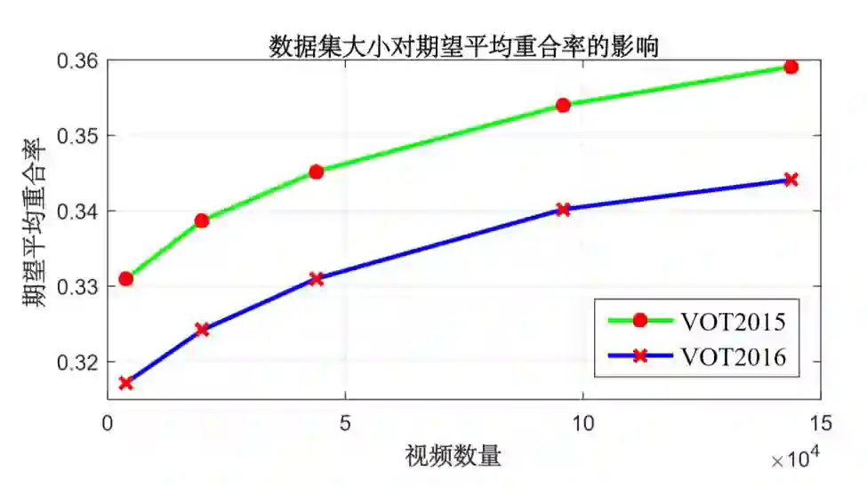 本文在不同数量视频的训练集下训练SiameseRPN。如图2所示,最左边的跟踪精度代表只用VID作为训练集的情况,可以看出,随着数据不断的增加,在VOT2015和VOT2016测试集上跟踪性能均不断提升,Youtube-BB数据集的引入让算法在VOT2016上的EAO从0.317提升至0.344,超过VOT2016的冠军方法CCOT,并且从曲线趋势上来看,跟踪性能还没有趋于饱和。这表明如果能够有更大量级的数据集,模型的跟踪精度能够进一步提升。这也就体现了数据驱动算法的优势。当目标跟踪与其它计算机视觉领域一样,出现了大量的跟踪数据集时,深度学习算法可以通过增加数据获得更好的性能,而传统的滤波方法不能采用离线训练,也无法有效的利用大数量级的跟踪数据。