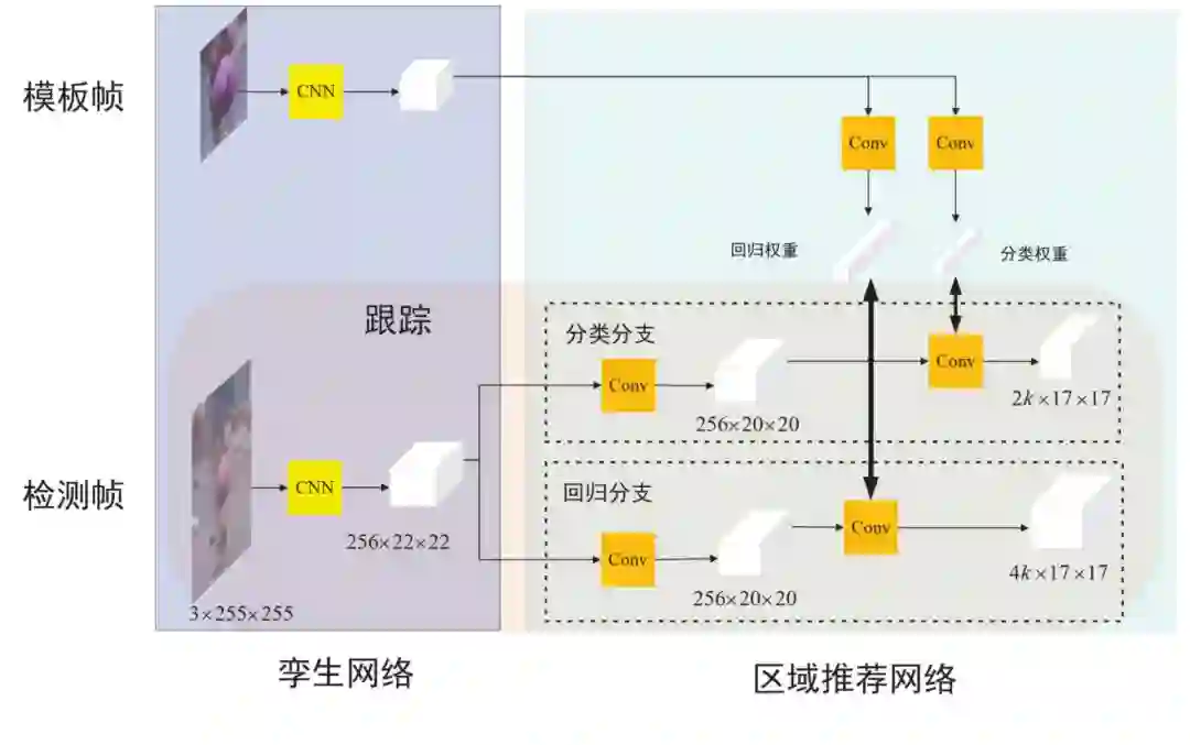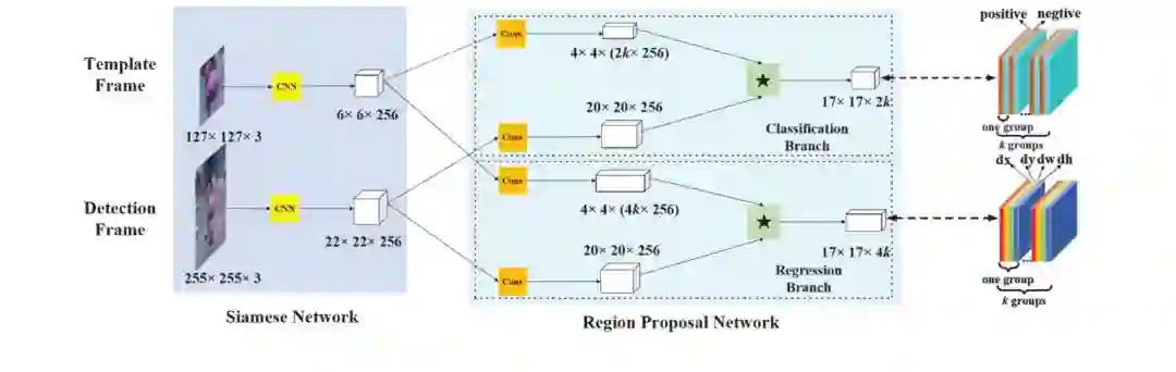 左边是用于提取特征的孪生(Siamese)网络;中间是区域推荐网络,包含了分类分支和回归分支,通过输入成对图像并进行相关(correlation,图1中“*”)等操作得到最后的输出。