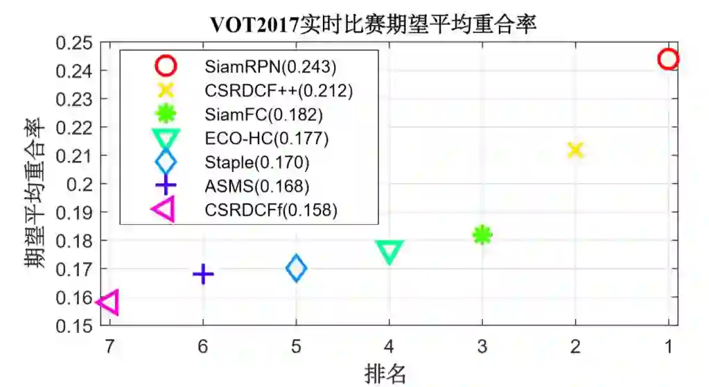 在VOT2017数据集中,VOT中10段最简单的视频被替换为了十段较难的视频。同时实验新增了实时比赛,要求跟踪算法必须能够在每秒处理20帧图像。若算法不能在50ms内完成处理当前帧,则使用上一帧结果代替。该规定导致速度较慢的跟踪算法会丢失多帧跟踪结果,无法有效跟踪目标。