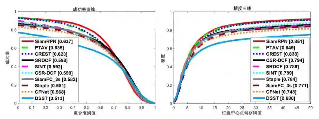 OTB数据集由跟踪社区经常使用的视频中挑选出的100段视频组成,主要评测指标包含成功和精度的曲线。精度曲线度量预测框与标注中心点小于某像素的帧的占比;成功率曲线则度量预测框与标注框的重合度超过某一阈值的帧的占比。本文将孪生区域推荐网络和几个比较有代表性的算法进行了对比,包含PTAV、CREST、SINT、CSR-DCF、SiameseFC、Stape、CFNet、DSST。结果如图7所示,本文提出的算法可以在OTB2015的两个指标上均取得第一。由于引入了区域推荐网络,新算法可以比基础算法SiameseFC提高5个点。