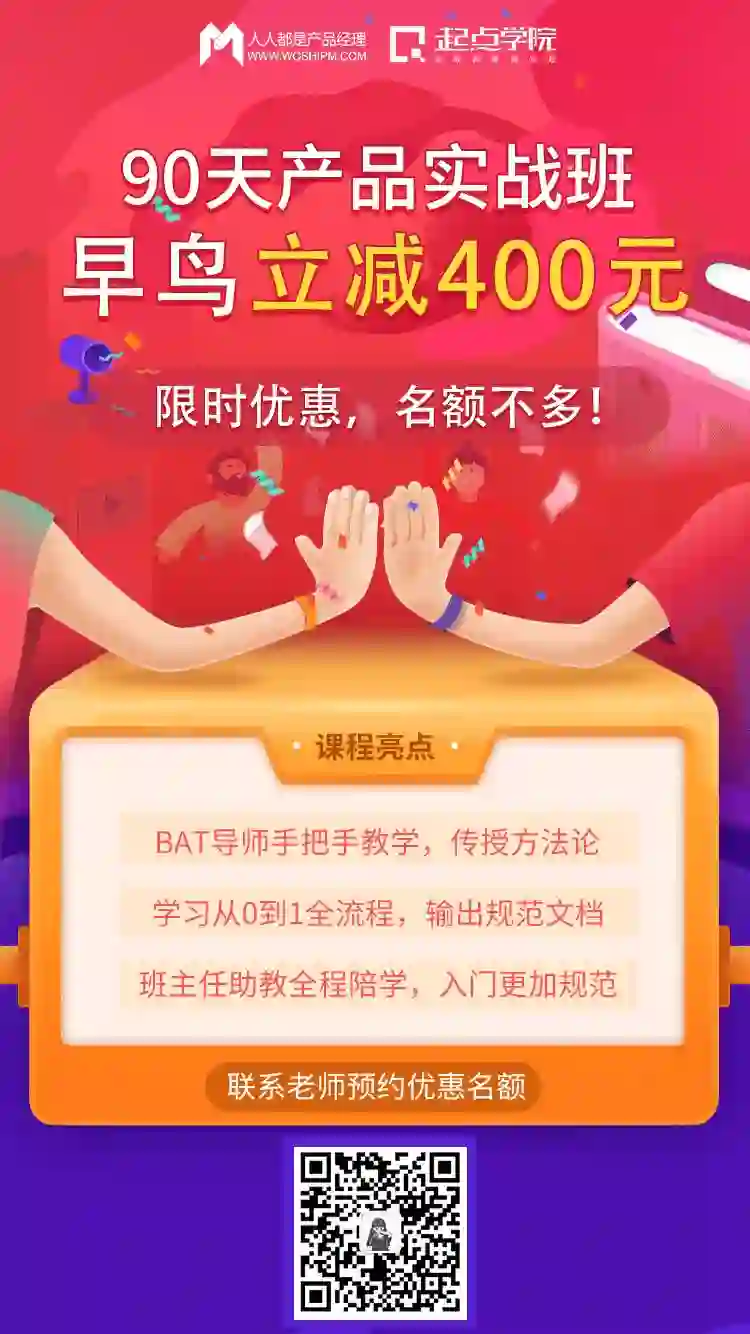 为了帮助更多想要入行产品的同学,在互联网碎片化时代更加高效的学习,掌握一套完整的工作方法论,获得更多的成长,这里向大家推荐起点学院联合腾讯课堂创办的「90天产品经理实战班」。由一线大厂实战派导师亲自授课,带你系统学习产品知识核心板块,从0到1体验产品实战全流程,达到产品岗位的用人要求!