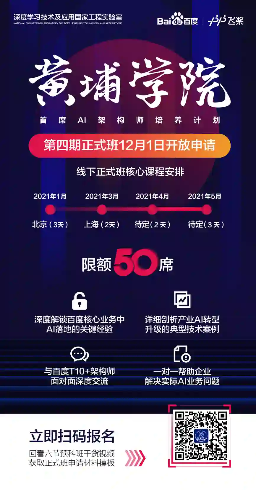 12月1日,百度黄埔学院第四期开放线下正式班申请,需要你带着“AI项目开题报告”有备而来,与百度T10+架构师一起,面对面探索产业智能化升级的新场景、新未来。