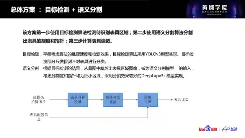 所以我们没选择直接识别的方案,因为直接识别会遇到多尺度的问题。我们选用了更为复杂的方案:目标检测+语义分割,当我的读数难度变小了,精确度会得到更好的保证,这是最核心的。同时,因为模型复杂度的提升,我的推理时间变长了。不过没关系,因为在表计巡检的场景里,对时效要求并不高。所以很多时候,大家问这样的方案好不好那样的方案好不好,还是要首先去回答自己的问题,你的场景到底有什么样的限制条件。没有最好,只有最适合。