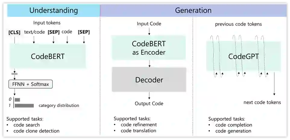 代码智能的下游任务包括代码搜索(Code Search)、代码完成(Code Completion)、代码修复(Code Repair)和代码翻译(Code Translation)等,实验发现,代码智能在自然语言代码检索、修复,文档生成、翻译等任务上均取得了 SOTA 效果。