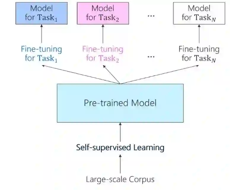 对大型数据库做 Self-supervised learning,针对大规模语料进行训练,可以得到预训练模型。