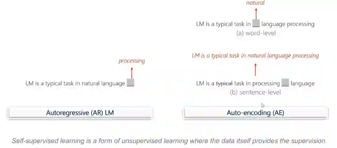 Self-supervise learning 可以利用数据的自然特点,不需要人工进行标注就可以进行训练和学习。Auto-encoding 可以对词或者句子进行覆盖或调整,让模型来猜测原来的词或原来的词序,其错误率可以调整网络。
