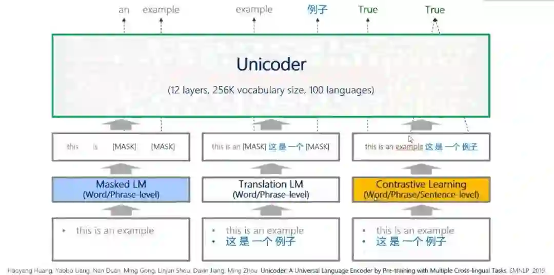 与经典的多元预训练模型相比,Unicoder 通过引入新任务 Constructive Learning (构造性学习)来预测两个词之间是否构成互译或者两个短语或句子之间是否构成互译,比如中英文句子的互译,该任务使预训练水平有所提高。