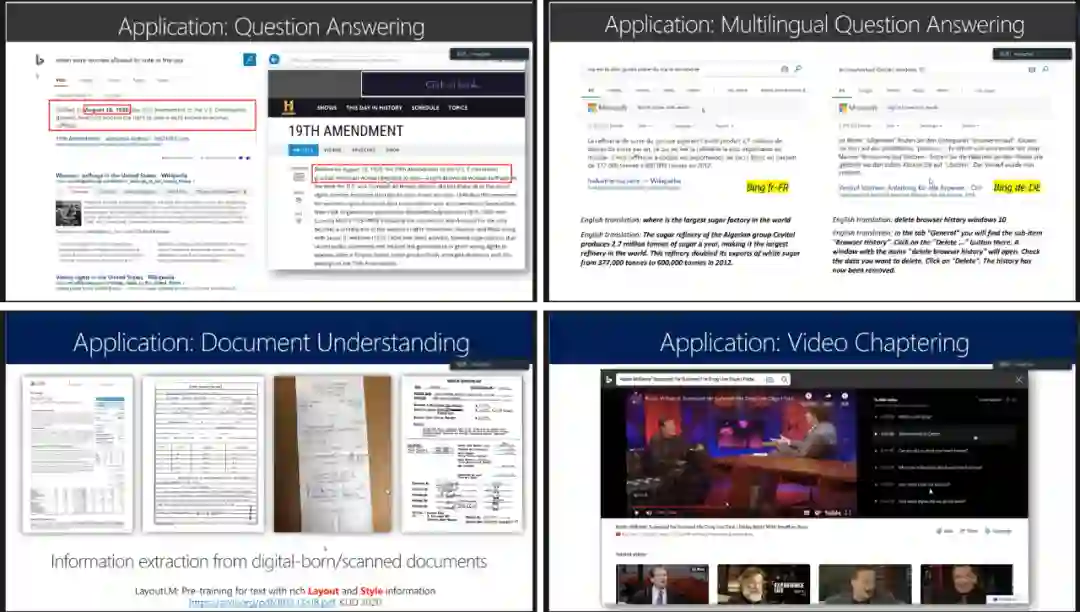 预训练模型的应用包括问答、多语言问答、文本理解和视频章节提取等。