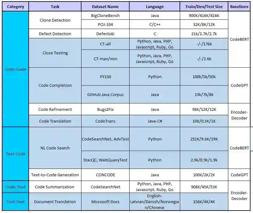 为了支持代码智能的研究,研究人员发布了数据集 CodeXGLUE。该数据集包括14个子数据集,用于10个多样化的代码智能任务,包括 Code-Code、Text-Code、Code-Text 和Text-Text 四大类。