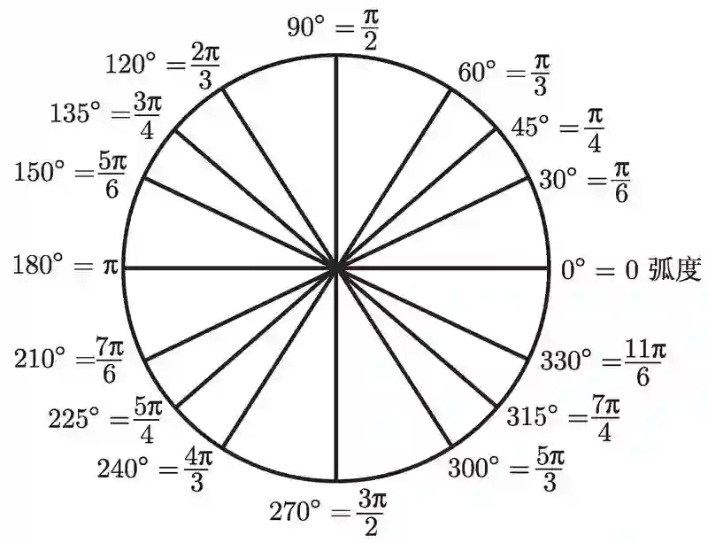 上图表示了一般情况, 但要紧的还是一些常用角的度和弧度表达. 首先, 你应该确实掌握, 90° 和 π/2 弧度是一样的. 类似地, 180° 和 π 弧度是一样的, 270° 和 3π/2 弧度是一样的. 一旦掌握了这几个角, 就试着将图 2-2 中所有的角在度与弧度之间来回转换吧.