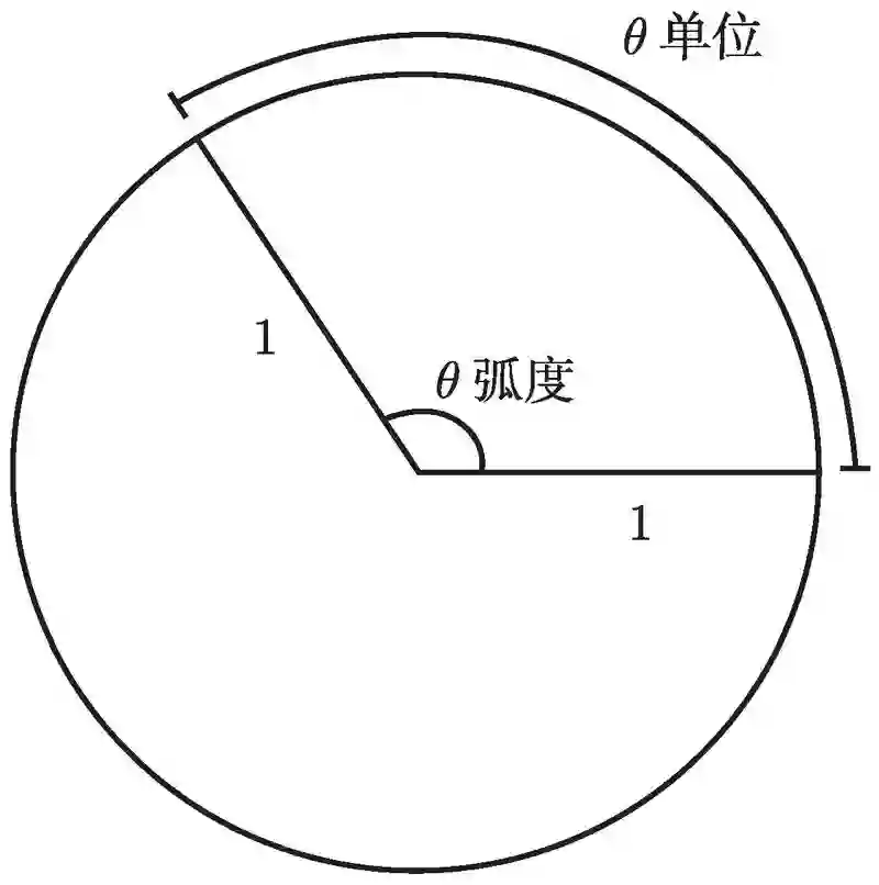 首先要回忆的是弧度的概念. 旋转一周, 我们说成 2π 弧度而不是 360°. 这似乎有点古怪, 但这里也有一个理由, 那就是半径为 1 个单位的圆的周长是 2π 个单位. 事实上, 这个圆的一个扇形的弧长就是这个扇形的圆心角的弧度, 如图 2-1 所示.