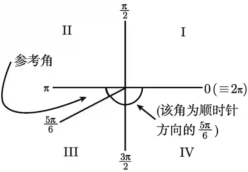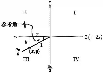 上例中的关键是将 sin (7π/6) 和 sin (π/6) 联系起来, 其中 π/6 是 7π/6 的参考角. 事实上, 并不难看出任意角的正弦就是其参考角正弦的正值或负值! 这就使问题缩小到两种可能性上, 而且没有必要再 x, y 或 r 如此这般麻烦. 因此, 在我们的例子中, 只需要求出 7π/6 的参考角, 即 π/6; 这就会立即可知 sin (7π/6) 等于 sin (π/6) 或 -sin (π/6), 而我们只需从中选出正确的结果. 我们发现, 结果是负的那个, 因为 y 是负的.