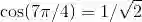 为了求出参考角, 注意到我们必须向上走到 2π (注意! 不是到 0), 因此, 参考角就是 2π 和 7π/4 的差, 即 (2π - 7π/4), 或简化为 π/4. 所以 cos (7π/4) 是正的或负的 cos (π/4). 根据表, cos (π/4) 是 . 但到底是正的还是负的呢?由 ASTC 图可知, 在第四象限中余弦为正, 故结果为正的那个: