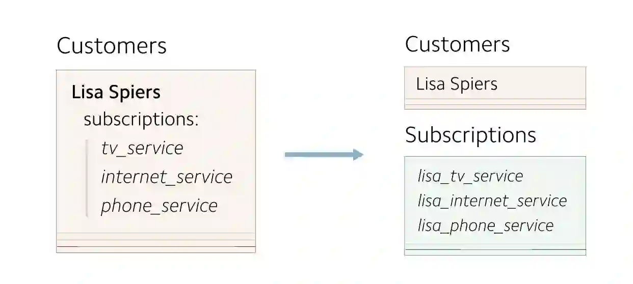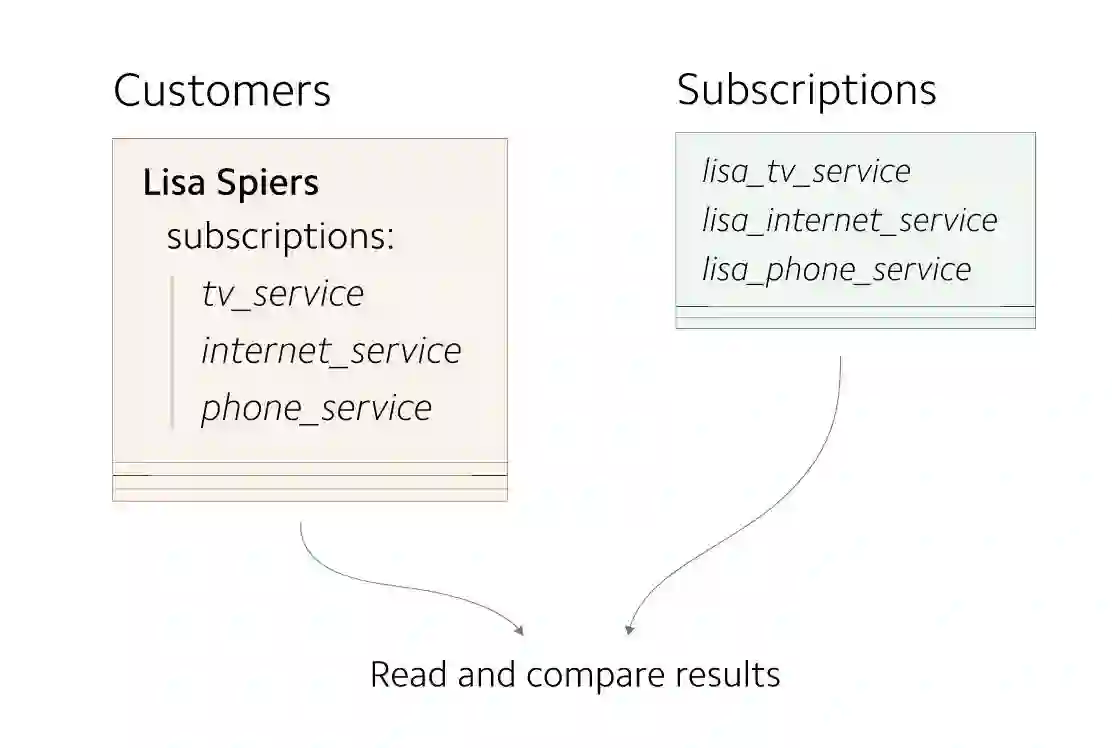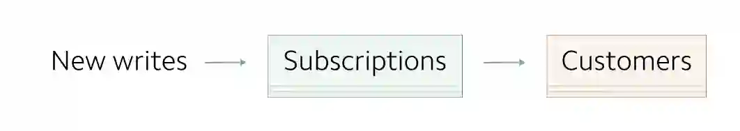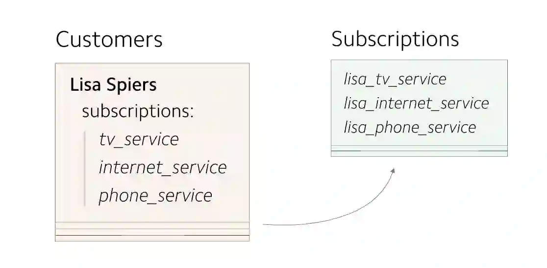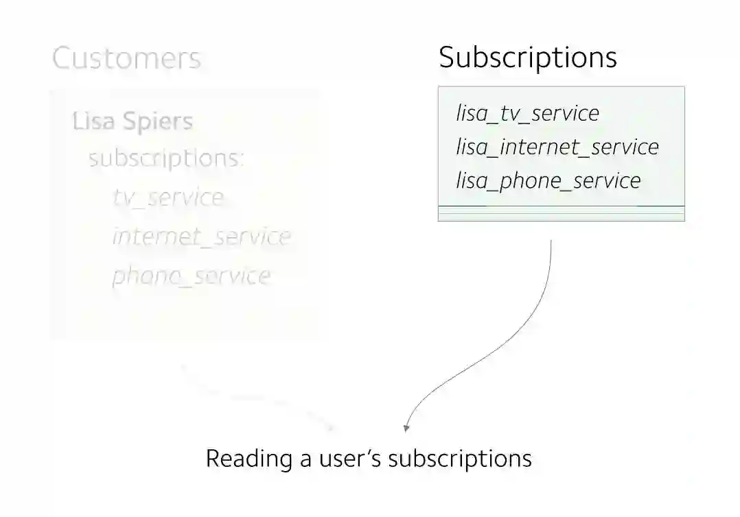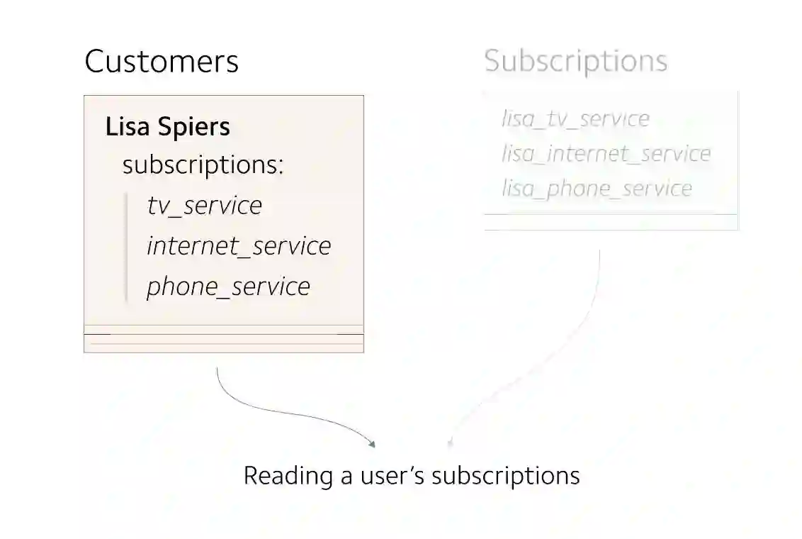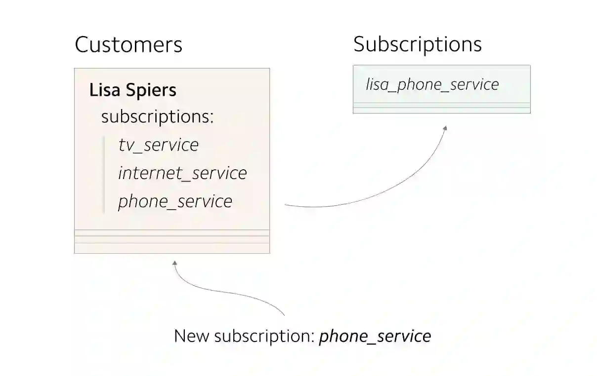 在早期,每个 Customer 对象最多只有一个 subscription 。 customers 信息存储为单独的记录。因为 customers 到 subscriptions 之间的映射关系非常简单,所以subscriptions 信息与 customers 信息存储在一起。