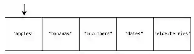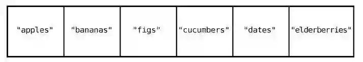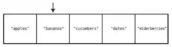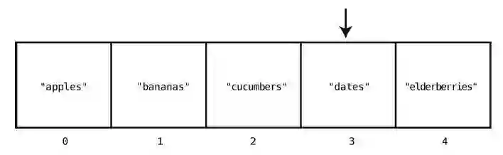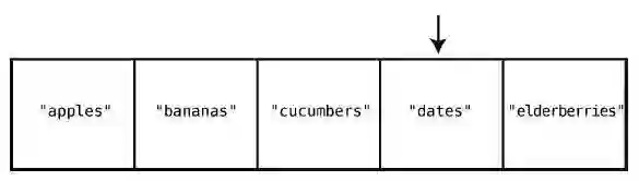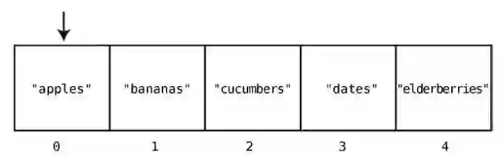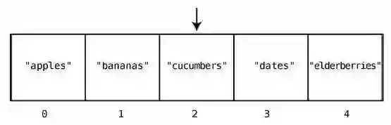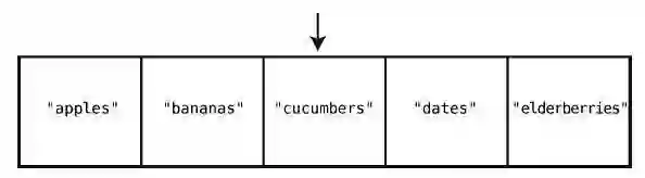这只要一步就够了,因为计算机本身就有跳到任一索引位置的能力。在["apples","bananas", "cucumbers", "dates", "elderberries"]的例子中,如果要查看索引2 的值,那么计算机就会直接跳到索引2,并告诉你那里有"cucumbers"。