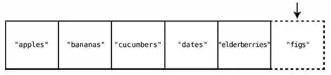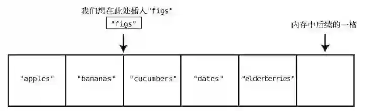 假设我们想要在购物清单的末尾插入"figs"。那么只需一步。因为之前说过了,计算机知道数组开头的内存地址,也知道数组包含多少个元素,所以可以算出要插入的内存地址,然后一步跳到那里插入就行了。图示如下。