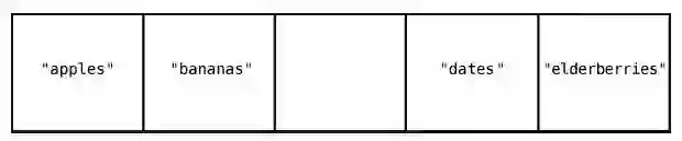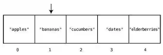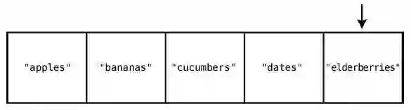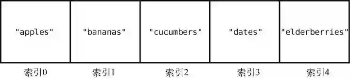 在大多数的编程语言中,索引是从0 算起的,因此在这个例子中,"apples"的索引为0,"elderberries"的索引为4,如下所示。